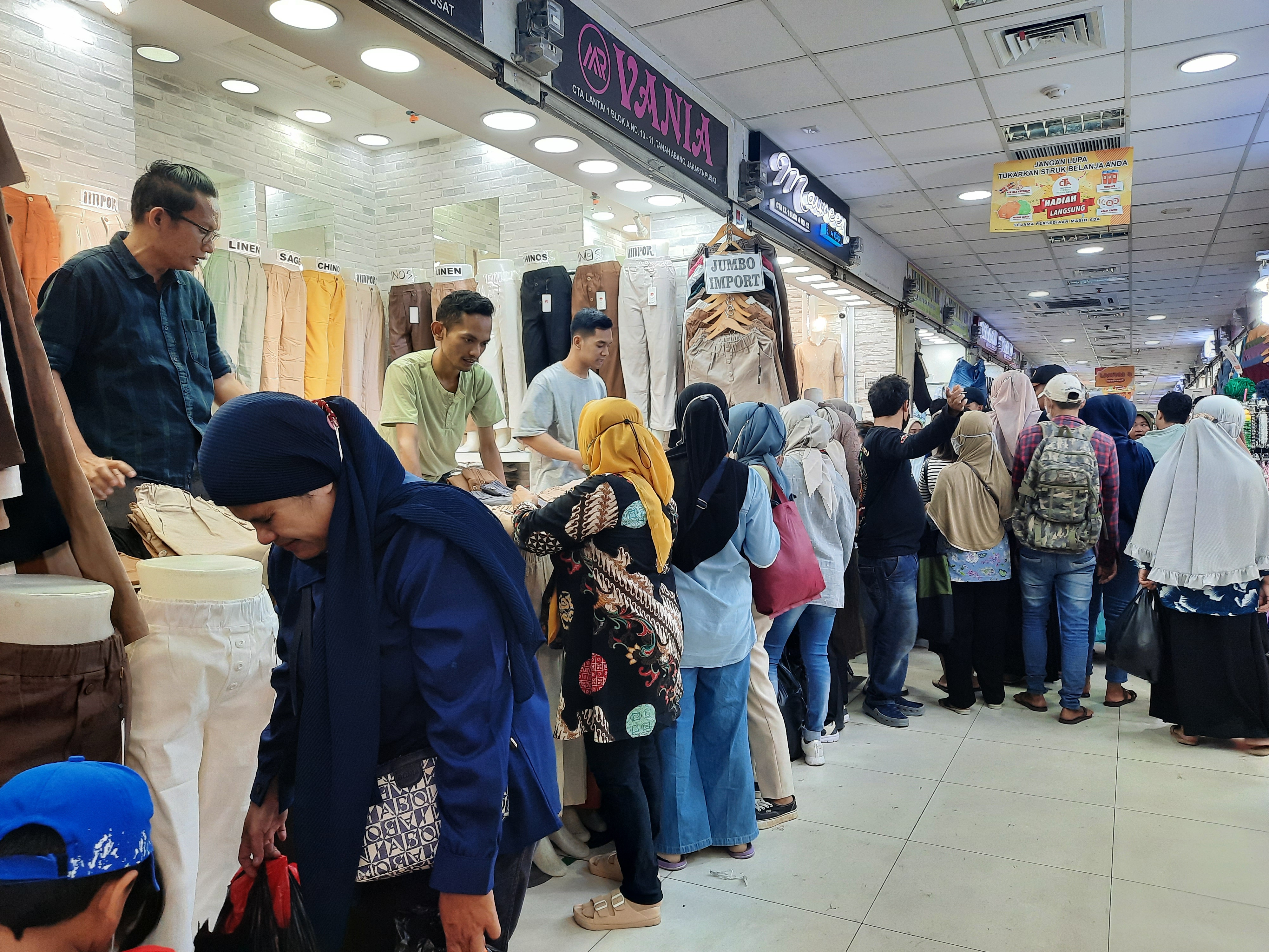 Hal ini terlihat dari pantauan Properti Indonesia, pengunjung sudah berdatangan mulai dari area Jembatan Multiguna, Pusat Grosir Central Tanah Aban (CTA) hingga Blok A. Rata-rata pengunjung membeli pakaian untuk Lebaran seperti gamis, tunik, hijab, baju koko, mukena, sarung, dan pakaian anak-anak.