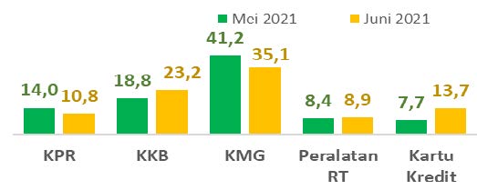 Menurut jenis pembiayaan yang diajukan, Kredit Multi Guna (KMG) merupakan jenis produk yang paling banyak diajukan oleh rumah tangga pada Juni 2021 dengan pangsa sebesar 35,1% dari total pengajuan pembiayaan. Berikutnya diikuti oleh Kredit Kendaraan Bermotor (KKB) dan Kredit Kepemilikan Rumah (KPR) masing-masing sebesar 23,2% dan 10,8% dari total pengajuan kredit pada Juni 2021. Pengajuan KKB, Kredit Peralatan Rumah Tangga, dan Kartu Kredit pada bulan Juni 2021 meningkat, sementara KPR dan KMG menurun dari bulan sebelumnya.
